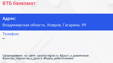 ВТБ, банкомат по адресу Владимирская область, Ковров, Гагарина, 99 в дальнейшем Организация, размещена в следующих категориях: