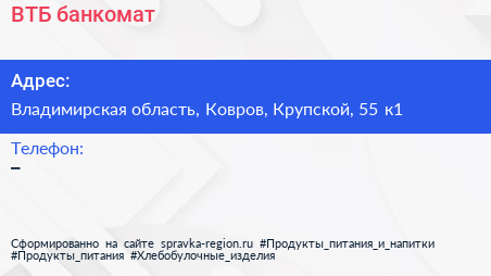 ВТБ, банкомат по адресу Владимирская область, Ковров, Крупской, 55 к1 в дальнейшем Организация, размещена в следующих категориях: