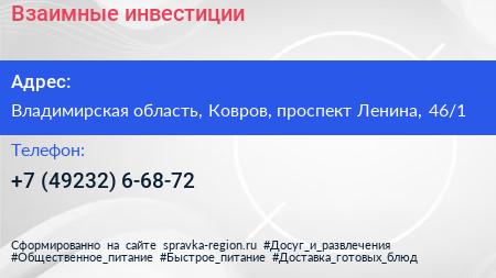 Взаимные инвестиции по адресу Владимирская область, Ковров, проспект Ленина, 46/1 в дальнейшем Организация, размещена в следующих категориях: