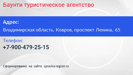 Баунти, туристическое агентство по адресу Владимирская область, Ковров, проспект Ленина, 65 в дальнейшем Организация, размещена в следующих категориях: