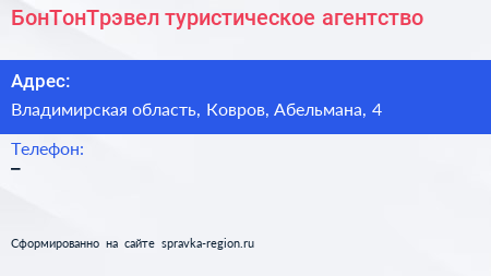 БонТонТрэвел, туристическое агентство по адресу Владимирская область, Ковров, Абельмана, 4 в дальнейшем Организация, размещена в следующих категориях: