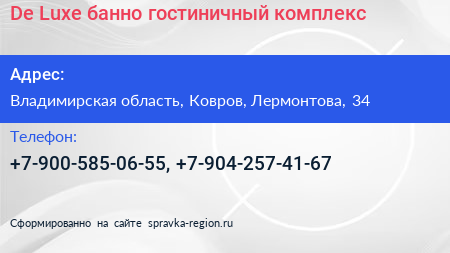De Luxe, банно-гостиничный комплекс по адресу Владимирская область, Ковров, Лермонтова, 34 в дальнейшем Организация, размещена в следующих категориях: