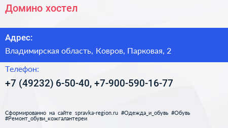 Домино, хостел по адресу Владимирская область, Ковров, Парковая, 2 в дальнейшем Организация, размещена в следующих категориях: