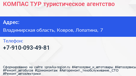 КОМПАС ТУР, туристическое агентство по адресу Владимирская область, Ковров, Лопатина, 7 в дальнейшем Организация, размещена в следующих категориях: