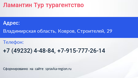 Ламантин Тур, турагентство по адресу Владимирская область, Ковров, Строителей, 29 в дальнейшем Организация, размещена в следующих категориях: