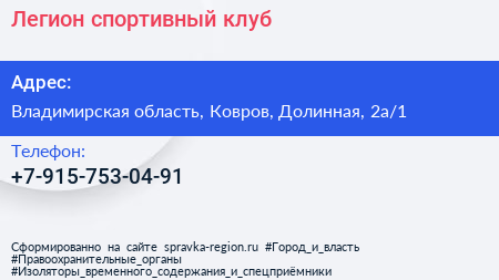 Легион, спортивный клуб по адресу Владимирская область, Ковров, Долинная, 2а/1 в дальнейшем Организация, размещена в следующих категориях: