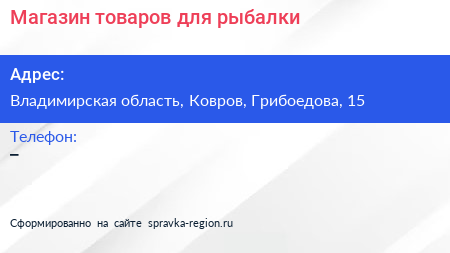 Магазин товаров для рыбалки по адресу Владимирская область, Ковров, Грибоедова, 15 в дальнейшем Организация, размещена в следующих категориях: