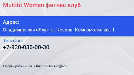Multifit. Woman, фитнес-клуб по адресу Владимирская область, Ковров, Комсомольская, 1 в дальнейшем Организация, размещена в следующих категориях: