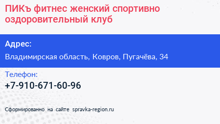 ПИКъ-фитнес, женский спортивно-оздоровительный клуб по адресу Владимирская область, Ковров, Пугачёва, 34 в дальнейшем Организация, размещена в следующих категориях: