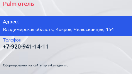 Palm, отель по адресу Владимирская область, Ковров, Челюскинцев, 154 в дальнейшем Организация, размещена в следующих категориях: