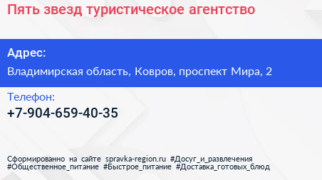 Пять звезд, туристическое агентство по адресу Владимирская область, Ковров, проспект Мира, 2 в дальнейшем Организация, размещена в следующих категориях: