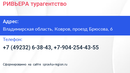РИВЬЕРА, турагентство по адресу Владимирская область, Ковров, проезд Брюсова, 6 в дальнейшем Организация, размещена в следующих категориях: