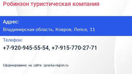 Робинзон, туристическая компания по адресу Владимирская область, Ковров, Лепсе, 11 в дальнейшем Организация, размещена в следующих категориях:
