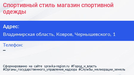 Спортивный стиль, магазин спортивной одежды по адресу Владимирская область, Ковров, Чернышевского, 1 в дальнейшем Организация, размещена в следующих категориях: