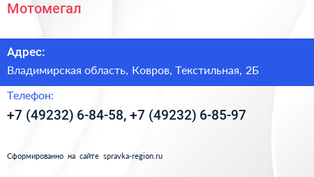 Мотомегал по адресу Владимирская область, Ковров, Текстильная, 2Б в дальнейшем Организация, размещена в следующих категориях: