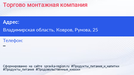 Торгово-монтажная компания по адресу Владимирская область, Ковров, Рунова, 25 в дальнейшем Организация, размещена в следующих категориях: