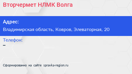 Вторчермет НЛМК Волга по адресу Владимирская область, Ковров, Элеваторная, 20 в дальнейшем Организация, размещена в следующих категориях: