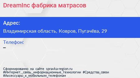 DreamInc, фабрика матрасов по адресу Владимирская область, Ковров, Пугачёва, 29 в дальнейшем Организация, размещена в следующих категориях: