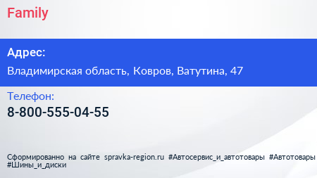 Family по адресу Владимирская область, Ковров, Ватутина, 47 в дальнейшем Организация, размещена в следующих категориях: