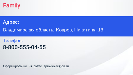 Family по адресу Владимирская область, Ковров, Никитина, 18 в дальнейшем Организация, размещена в следующих категориях: