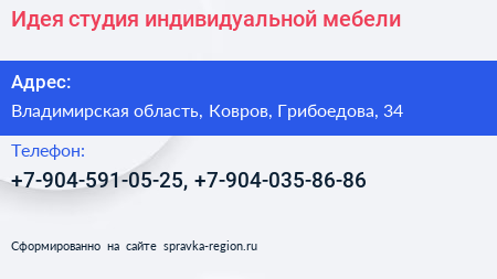 Идея, студия индивидуальной мебели по адресу Владимирская область, Ковров, Грибоедова, 34 в дальнейшем Организация, размещена в следующих категориях: