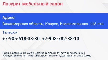 Лазурит, мебельный салон по адресу Владимирская область, Ковров, Комсомольская, 116 ст4 в дальнейшем Организация, размещена в следующих категориях: