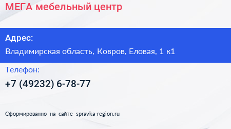 МЕГА, мебельный центр по адресу Владимирская область, Ковров, Еловая, 1 к1 в дальнейшем Организация, размещена в следующих категориях: