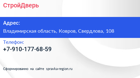 СтройДверь по адресу Владимирская область, Ковров, Свердлова, 108 в дальнейшем Организация, размещена в следующих категориях: