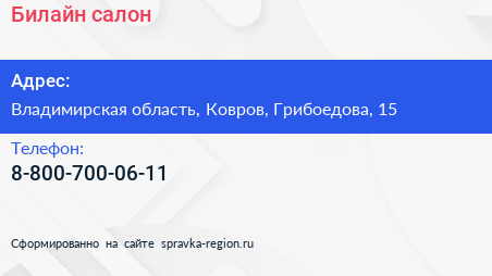 Билайн, салон по адресу Владимирская область, Ковров, Грибоедова, 15 в дальнейшем Организация, размещена в следующих категориях: