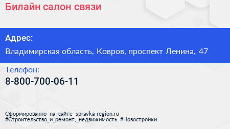 Билайн, салон связи по адресу Владимирская область, Ковров, проспект Ленина, 47 в дальнейшем Организация, размещена в следующих категориях: