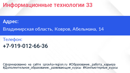 Информационные технологии 33 по адресу Владимирская область, Ковров, Абельмана, 14 в дальнейшем Организация, размещена в следующих категориях:
