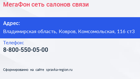 МегаФон, сеть салонов связи по адресу Владимирская область, Ковров, Комсомольская, 116 ст3 в дальнейшем Организация, размещена в следующих категориях: