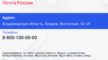 Почта России по адресу Владимирская область, Ковров, Восточная, 52 к9 в дальнейшем Организация, размещена в следующих категориях: