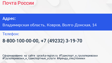 Почта России по адресу Владимирская область, Ковров, Волго-Донская, 14 в дальнейшем Организация, размещена в следующих категориях: