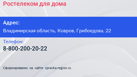 Ростелеком для дома по адресу Владимирская область, Ковров, Грибоедова, 22 в дальнейшем Организация, размещена в следующих категориях: