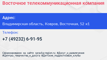 Восточное, телекоммуникационная компания по адресу Владимирская область, Ковров, Восточная, 52 к1 в дальнейшем Организация, размещена в следующих категориях: