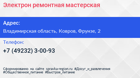 Электрон, ремонтная мастерская по адресу Владимирская область, Ковров, Фрунзе, 2 в дальнейшем Организация, размещена в следующих категориях: