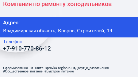 Компания по ремонту холодильников по адресу Владимирская область, Ковров, Строителей, 14 в дальнейшем Организация, размещена в следующих категориях: