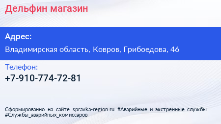 Дельфин, магазин по адресу Владимирская область, Ковров, Грибоедова, 46 в дальнейшем Организация, размещена в следующих категориях: