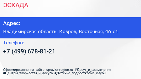 ЭСКАДА по адресу Владимирская область, Ковров, Восточная, 46 с1 в дальнейшем Организация, размещена в следующих категориях: