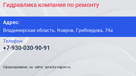 Гидравлика, компания по ремонту по адресу Владимирская область, Ковров, Грибоедова, 74а в дальнейшем Организация, размещена в следующих категориях: