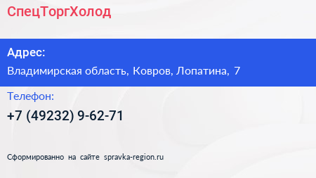 СпецТоргХолод по адресу Владимирская область, Ковров, Лопатина, 7 в дальнейшем Организация, размещена в следующих категориях: