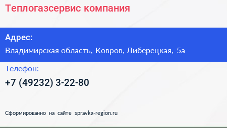 Теплогазсервис, компания по адресу Владимирская область, Ковров, Либерецкая, 5а в дальнейшем Организация, размещена в следующих категориях: