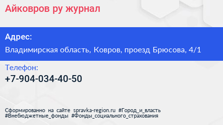 Айковров.ру, журнал по адресу Владимирская область, Ковров, проезд Брюсова, 4/1 в дальнейшем Организация, размещена в следующих категориях: