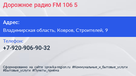 Дорожное радио, FM 106.5 по адресу Владимирская область, Ковров, Строителей, 9 в дальнейшем Организация, размещена в следующих категориях: