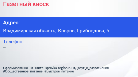Газетный киоск по адресу Владимирская область, Ковров, Грибоедова, 5 в дальнейшем Организация, размещена в следующих категориях: