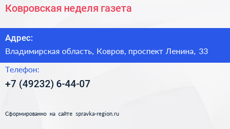 Ковровская неделя, газета по адресу Владимирская область, Ковров, проспект Ленина, 33 в дальнейшем Организация, размещена в следующих категориях: