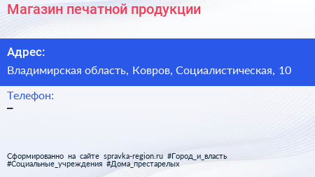 Магазин печатной продукции по адресу Владимирская область, Ковров, Социалистическая, 10 в дальнейшем Организация, размещена в следующих категориях: