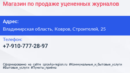 Магазин по продаже уцененных журналов по адресу Владимирская область, Ковров, Строителей, 25 в дальнейшем Организация, размещена в следующих категориях: