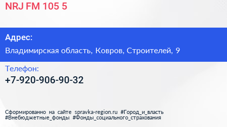 NRJ, FM 105.5 по адресу Владимирская область, Ковров, Строителей, 9 в дальнейшем Организация, размещена в следующих категориях: